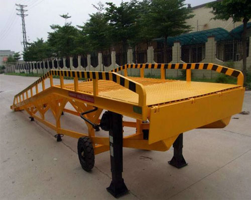 二、要特別注意移動式登車橋必須在平坦堅實的地面上工作;如果要移動此設備,將接地連接板先收起,調節支撐架及可調節支撐腿要回收離開地面,用叉車或其他設備抬起接地連接板一端前移,在移動輪的作用下可以輕松移動到所需的位置;